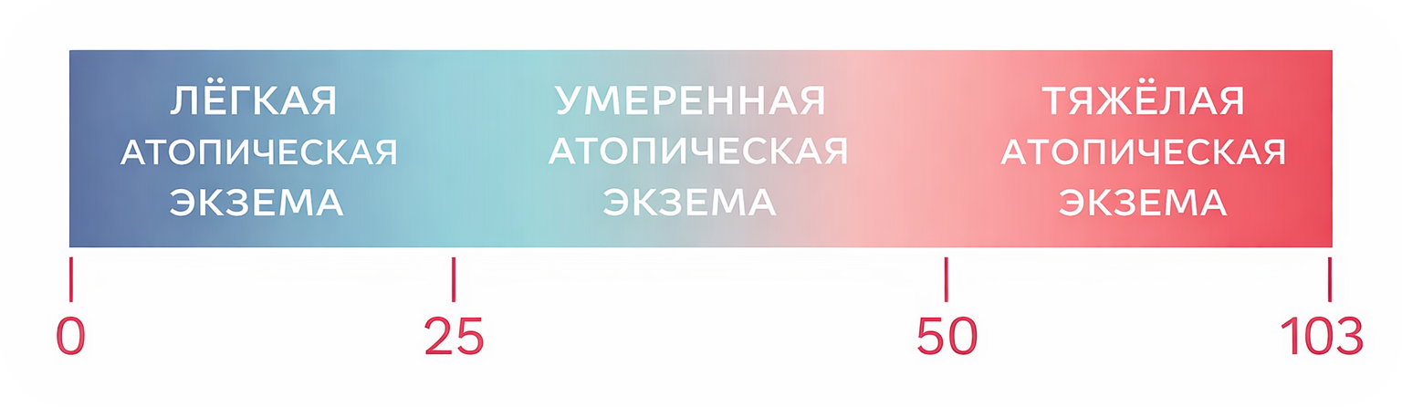 | Тяжёлое течение SCORAD > 50 Непрерывные рецидивы | - Госпитализация. - Системная иммуносупрессивная терапия: циклоспорин A, короткий курс системных ГКС, дупилумаб, метотрексат, азатиоприн, ПУВА-терапия, алитретиноин |