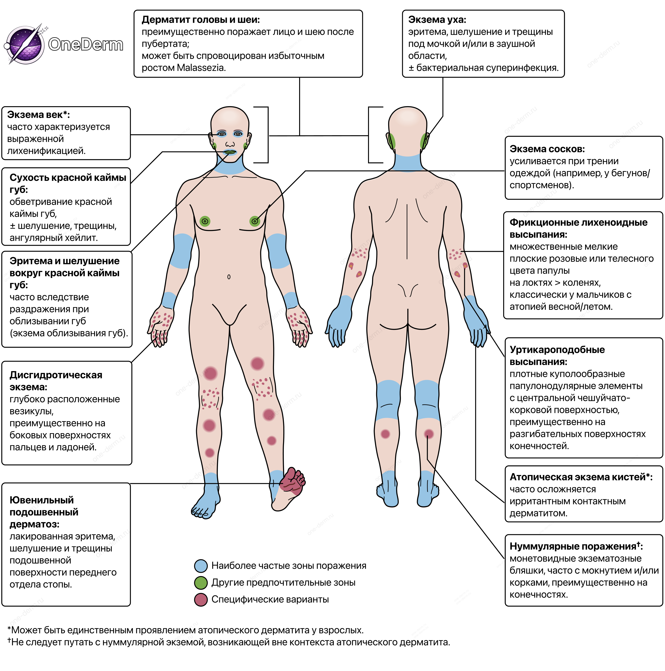 | Эмоленты | • Ежедневное использование 2 раза в сутки, длительно (постоянно, возможно с уменьшением кратности в период стойкой ремиссии) |